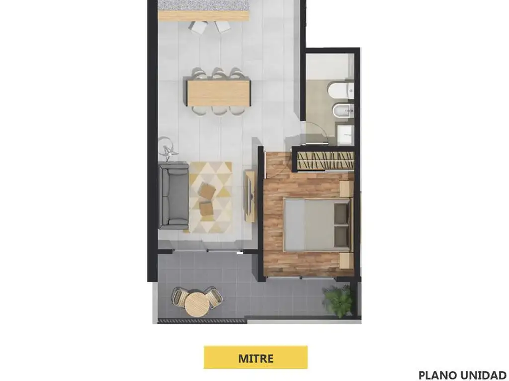 Unidad ubicada en piso 4 con disposición al frente y orientación oeste. Cuenta con 50,45 m2 cubiertos y 9,10 m2 descubiertos, totalizando 59,55 m2. Se compone de amplio estar comedor con cocina semi integrada y buen espacio de guardado, con salida a balcón corrido sobre calle Mitre. Dormitorio con placard y acceso al balcón mediante ventanal. Baño completo. La unidad presenta ventilación cruzada, buena iluminación natural, gas natural y se encuentra en excelente estado con antiguedad aproximada de 2 años.