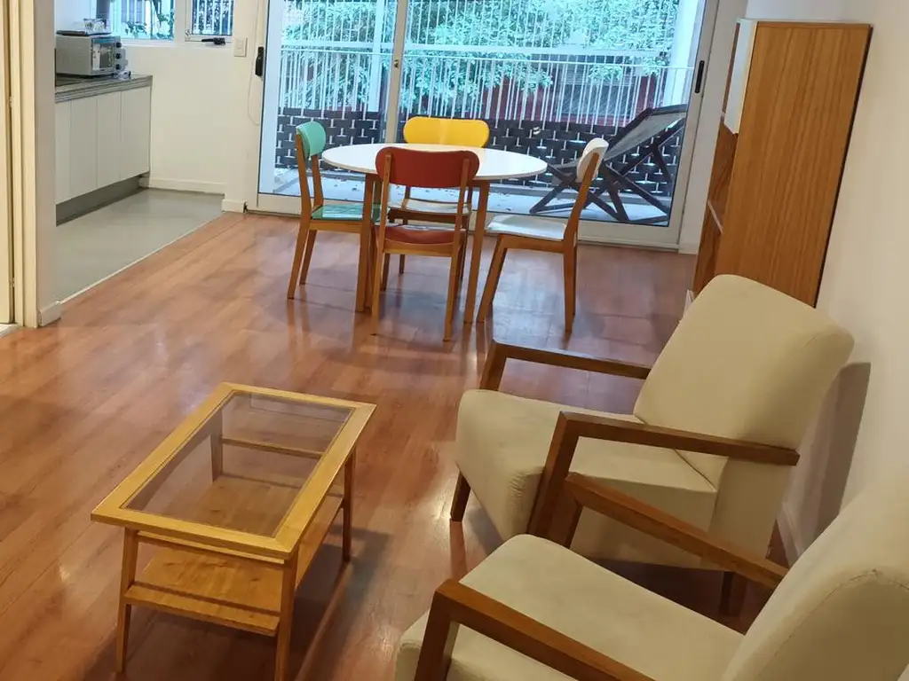 LIVING Y DORMITORIO: amplio con salida al balcón, mesa con sillas, sillón con sus almohadones.