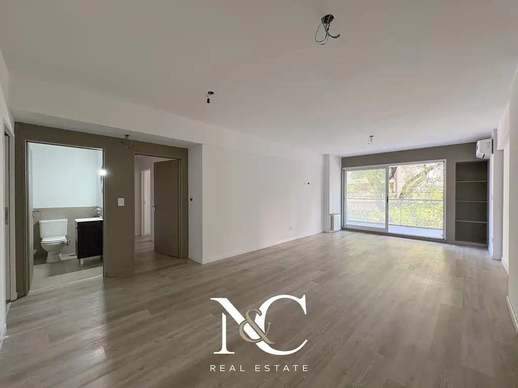 El departamento cuenta con cuatro ambientes al frente, distribuidos en un amplio living comedor con aire acondicionado y salida al balcón. La cocina comedor es moderna y está equipada, con un lavadero separado que aporta practicidad al día a día.