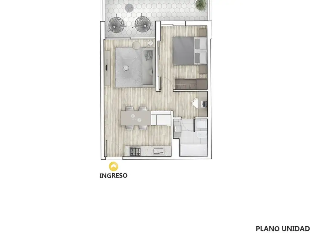 Ingreso a living-comedor con cocina integrada. Salida a balcón que funciona como expansión del área social. En el sector íntimo se desarrollan dos dormitorios y un baño completo. Distribución eficiente con buena separación entre áreas sociales y privadas.