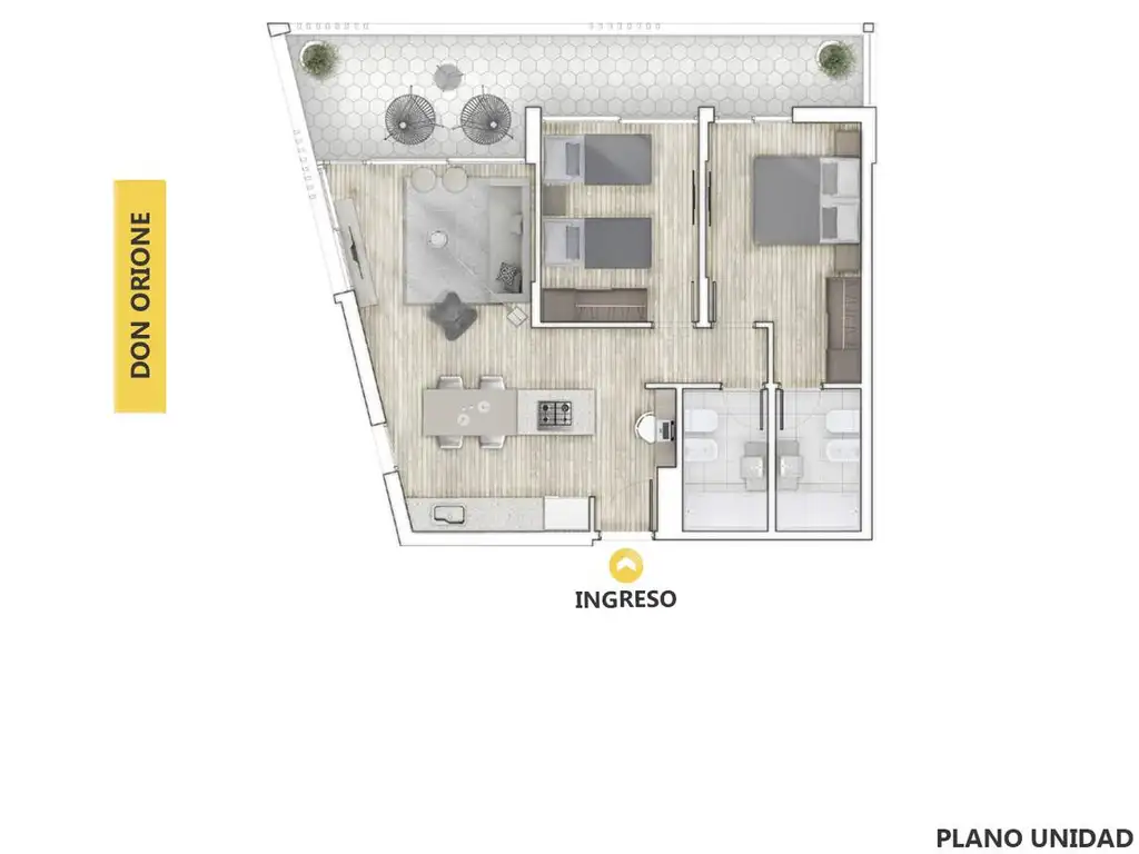 Ingreso a living-comedor con cocina integrada. Salida a balcón que funciona como expansión del área social. En el sector íntimo se desarrollan dos dormitorios y un baño completo. Distribución eficiente con buena separación entre áreas sociales y privadas.