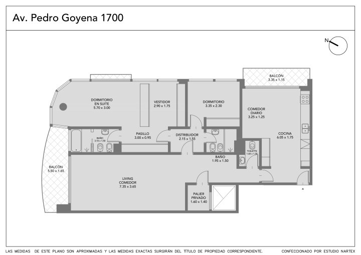 Es un departamento de 4 ambientes transformado a 3 con gran vestidor en dormitorio principal de 128 m² totales (117 m² cubiertos), situado en el 5° piso sobre Av. Pedro Goyena al 1700, en el barrio de Caballito.