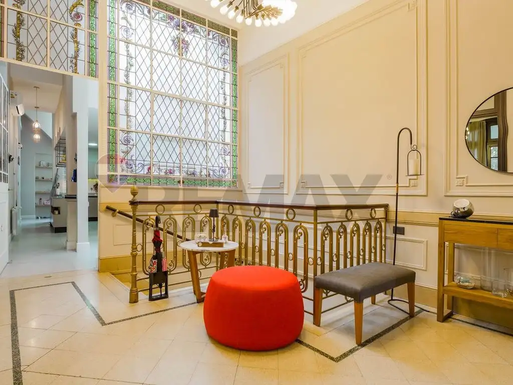 Acceso por escalera de mármol a hall de recepción con vitreaux.