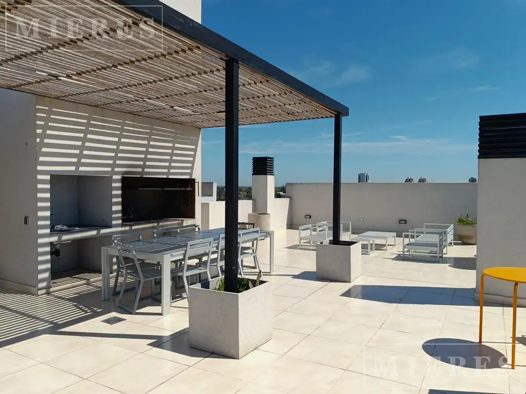 El edificio cuenta con una gran terraza con parrillas + piscina + solarium. Gimnasio , Circuito cerrado de cámaras y seguridad las 24 horas.