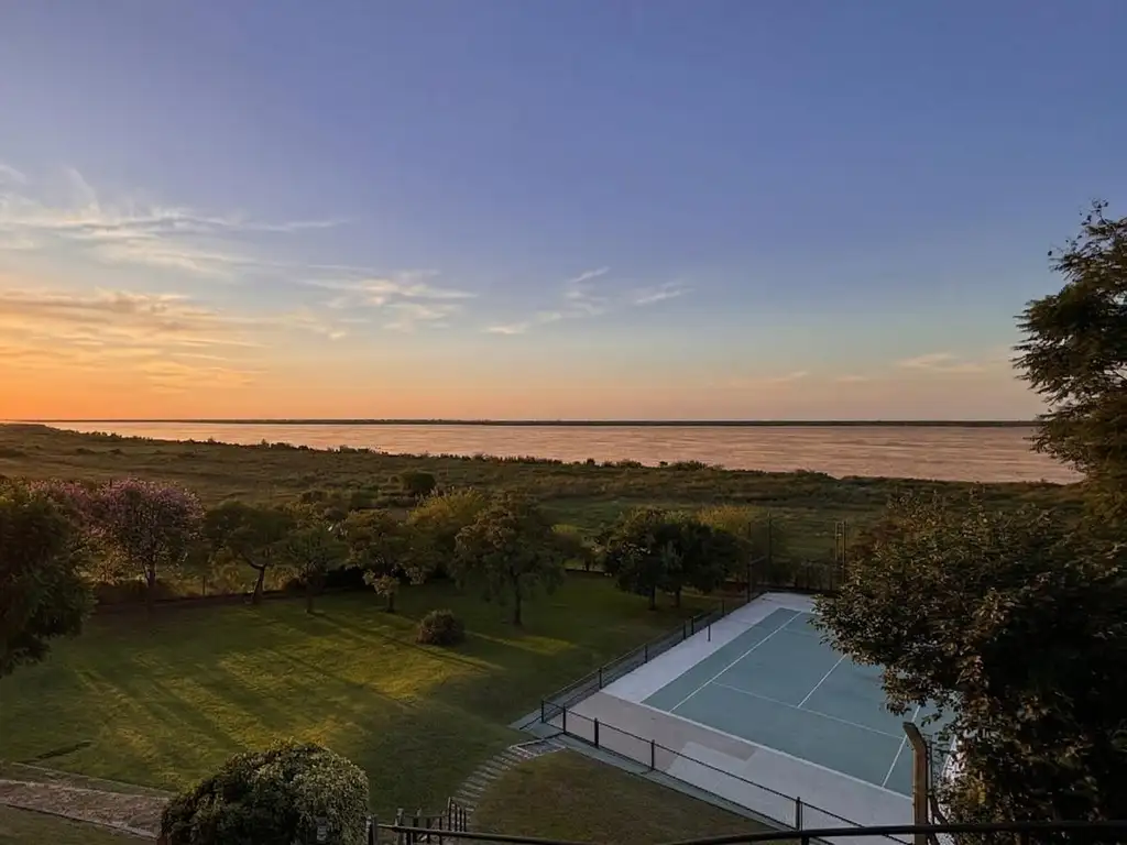 Los exteriores son el gran diferencial de esta propiedad: pileta con deck y vistas al río, cancha de tenis propia, parque parquizado con árboles añosos de gran porte, parrilla, horno de barro, salón de juegos y 3 cocheras. El terreno de 9.558 m2 tiene pendiente natural hacia el río, con caminos internos y sectores diferenciados que multiplican las posibilidades de uso.