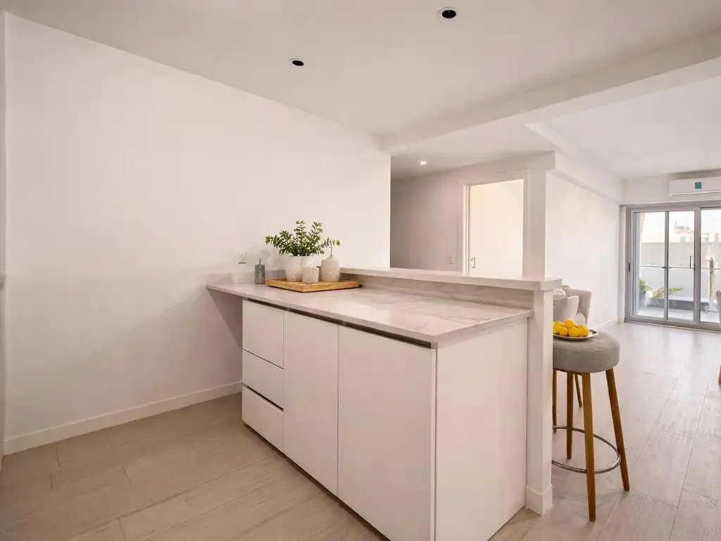 Amplio livingcomedor con salida a balcón corrido, ideal para disfrutar del aire libre. Cocina integrada con desayunador, equipada con horno y muebles bajo y sobre mesada.