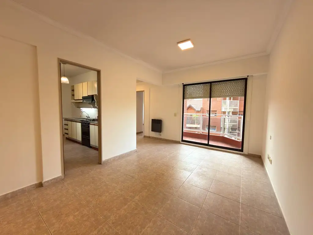 El living comedor se presenta como un espacio amplio y confortable, con pisos cerámicos en excelente estado, calefactor a gas y artefactos de iluminación ya instalados. La salida al balcón se da a través de una gran abertura con persiana, lo que no solo aporta luminosidad sino también una buena conexión con el exterior, generando un ambiente agradable y funcional. La cocina, separada y bien definida, ofrece un diseño práctico con muebles bajo y alto mesada, artefacto de cocina a gas con extractor, espacio para heladera y conexión para lavarropas. Cuenta además con ventilación natural a través de una ventana, lo que mejora la circulación de aire y el uso diario del espacio.