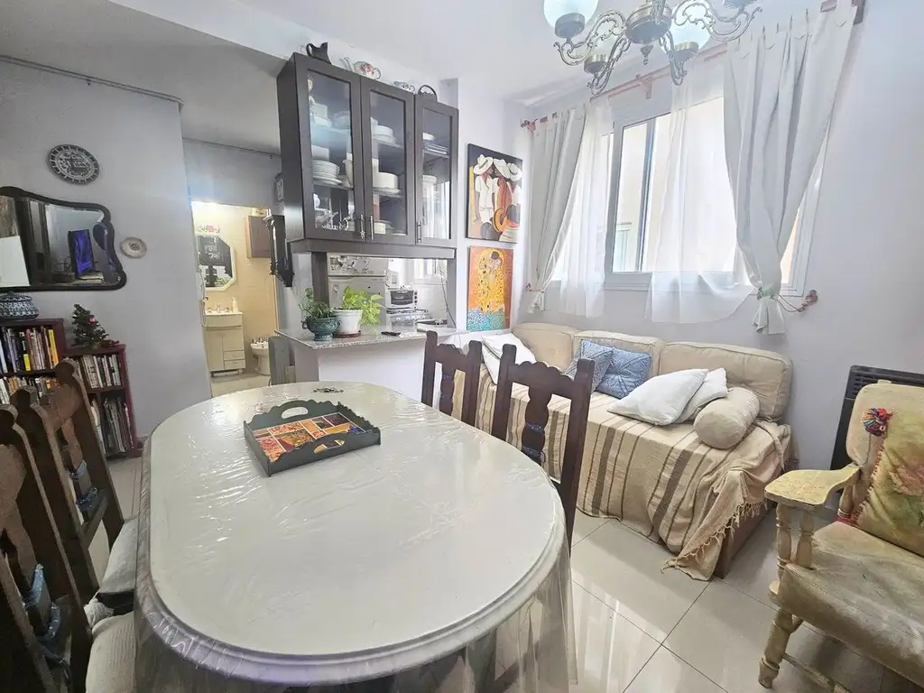 La unidad presenta una distribución funcional con dos ambientes, compuestos por una habitación con doble placard y un baño completo con ducha. La cocina, diseñada con pasaplatos, optimiza el aprovechamiento del espacio interior.