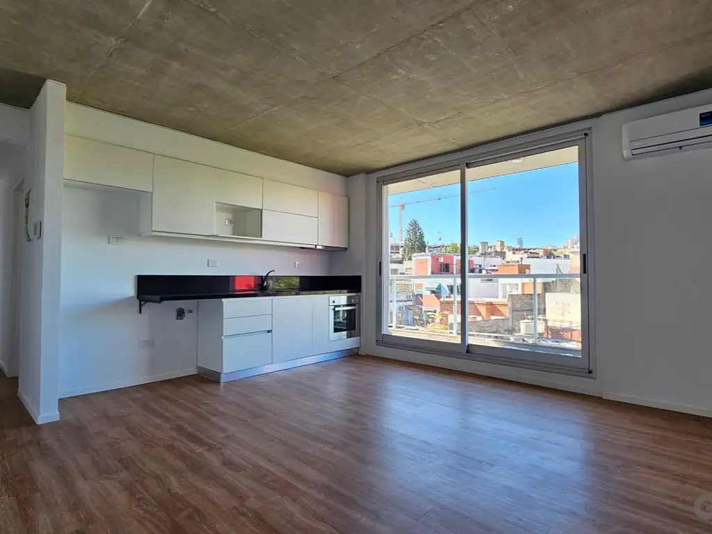 La unidad cuenta con living-comedor con cocina integrada, diseño moderno y excelente entrada de luz natural gracias a su orientación oeste. Dispone de 2 dormitorios, 1 baño completo y un balcón que aporta ventilación y expansión al espacio.