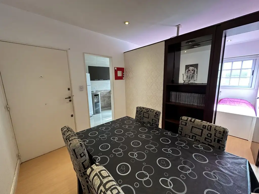 Living comedor con mesas y sillas, TV LED 42 pulgadas, Wifi fibra óptica, pasillo de distribución con 2 dormitorios y un baño completo con bañera.
