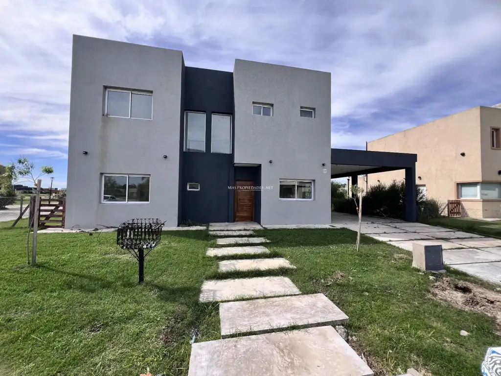 Ubicada a solo 2 minutos del ingreso y a una cuadra del club house y amenities del barrio, esta espectacular casa de 6 ambientes promete un estilo de vida único. En la planta baja, se encuentra una amplia cocina comedor integrada con el living, un baño de recepción y un dormitorio que puede ser utilizado como estudio. La planta alta alberga cuatro amplias habitaciones, siendo la principal en suite con baño y vestidor. Tres de las habitaciones cuentan con salida a una gran terraza compartida, que ofrece una vista impresionante a la primera laguna del barrio.
