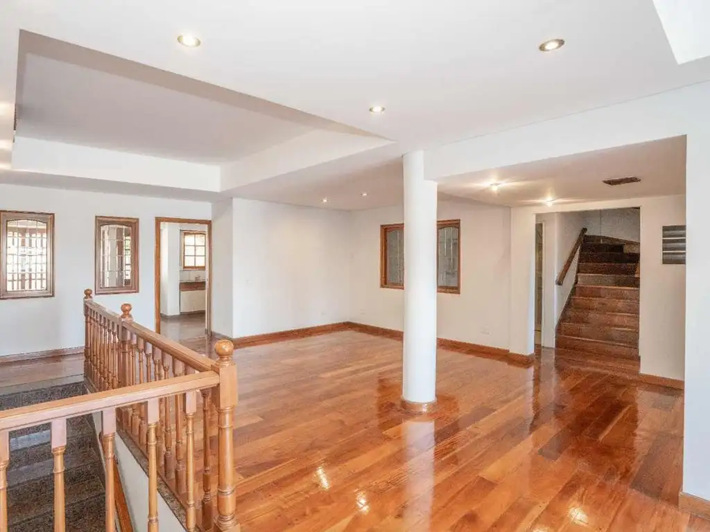 Amplio living con pisos de madera plastificado, y ventanas de madera con vista a la cocina, también cuenta con un espacio con barra de bar.