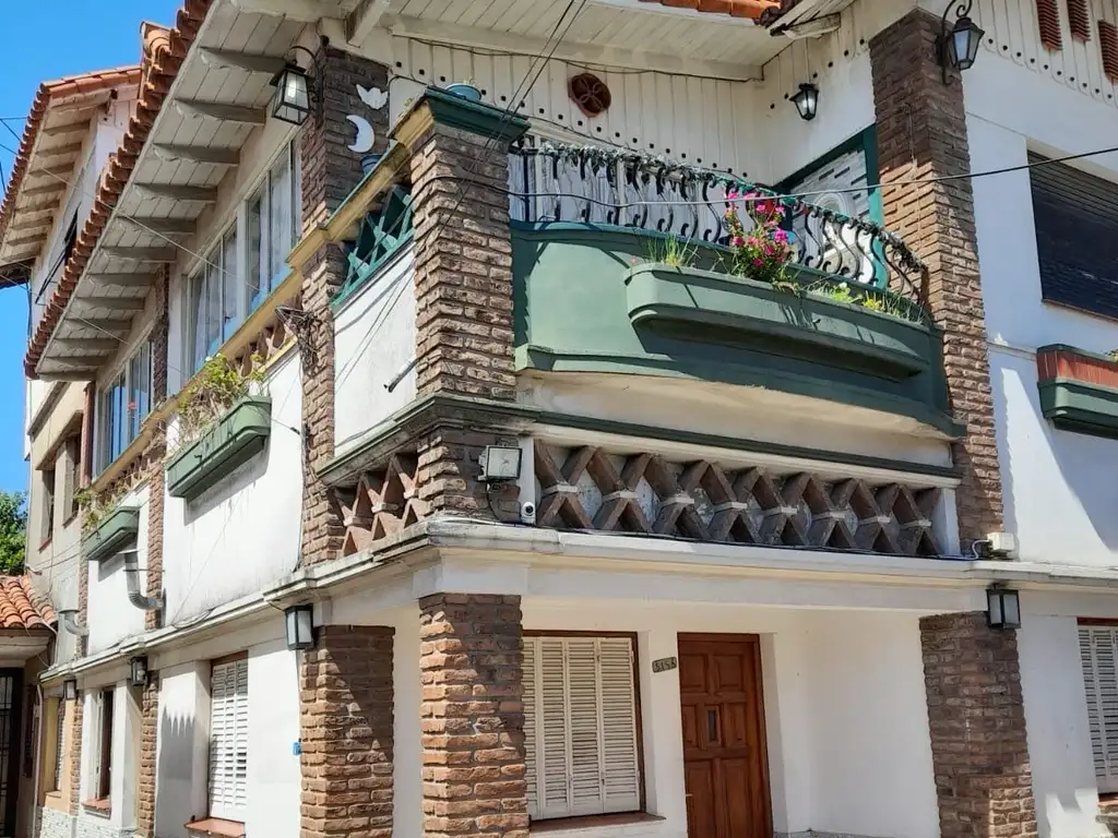 Es una vivienda con 2 entradas 1 principal 1 de servicio de 4 ambientes, 2 dormitorios con pisos de pinotea, living-comedor de 4x 9mts con chimenea , cocina, comedor diario, baño con bañera, balcón amplio, puertas de cedro, detalles de estilo techo de tejas españolas.