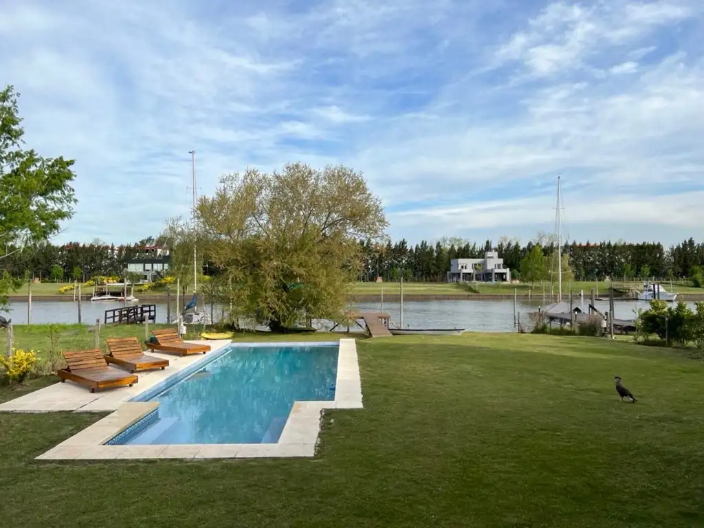 En su exterior tiene un hermoso jardin con pileta y vista al rio, amarras, y una amplia galería techada con parrilla. 1 cochera techada, mas espacio para otro auto.