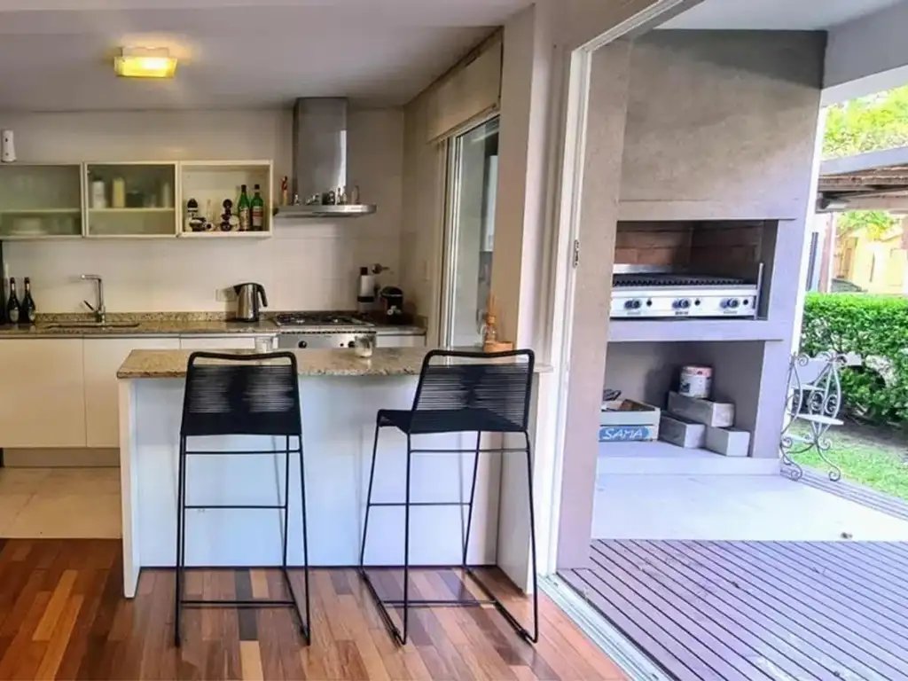 .Cocina integrada con bajo mesada y alacenas, barra desayunadora con lugar de guardado, bacha doble de acero con grifería monocomando, campana extractora de aire, horno y cocina a gas.