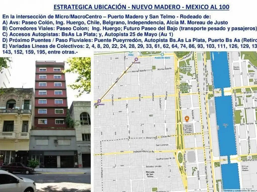 Ideal uso Empresarial, Corporativo, Institucional ; Zonificación C2 ; Tipologías de Plantas Flexibles Permite diversos usos y destinos ; Estratégica Ubicación en Nuevo Madero (Intersección de Micro/Macro Centro, Puerto Madero y San Telmo) Mexico al 100 (entre Av. Paseo Colon y Azopardo) rodeado de Avenidas, Corredores Viales y Acceso al AMBA de Transporte Publico (Pasajeros y mercaderías) y Futuro Paseo del Bajo, Parques y diversas Instituciones (Educativas, Organismos Públicos, etc.) ; Edificio A Estrenar Importante Estructura y Solida Construcción, Estudiado y Optimo Uso de Espacios y metros de alfombra (Ver planos) ; con una Superficie Total aprox de 3.046m2 y Sup Total Cub Aprox de 2.633m2; repartidos en Planta Baja 1 Subsuelo y 11 Pisos (o Entrepiso + 10 Pisos) ; de 5 Oficinas individuales, 7 Plantas Libres, 20 espacios guardacoches, Vivienda o Gerencial, Expansiones de Terrazas y Jardín Ecológico, totalizando una Sup Total de Uso Exclusivo de 1.906m2 y Cub o de Alfombra de Aprox 1.805m2 + guardacoches y baulera (Ver Balance Superficies).