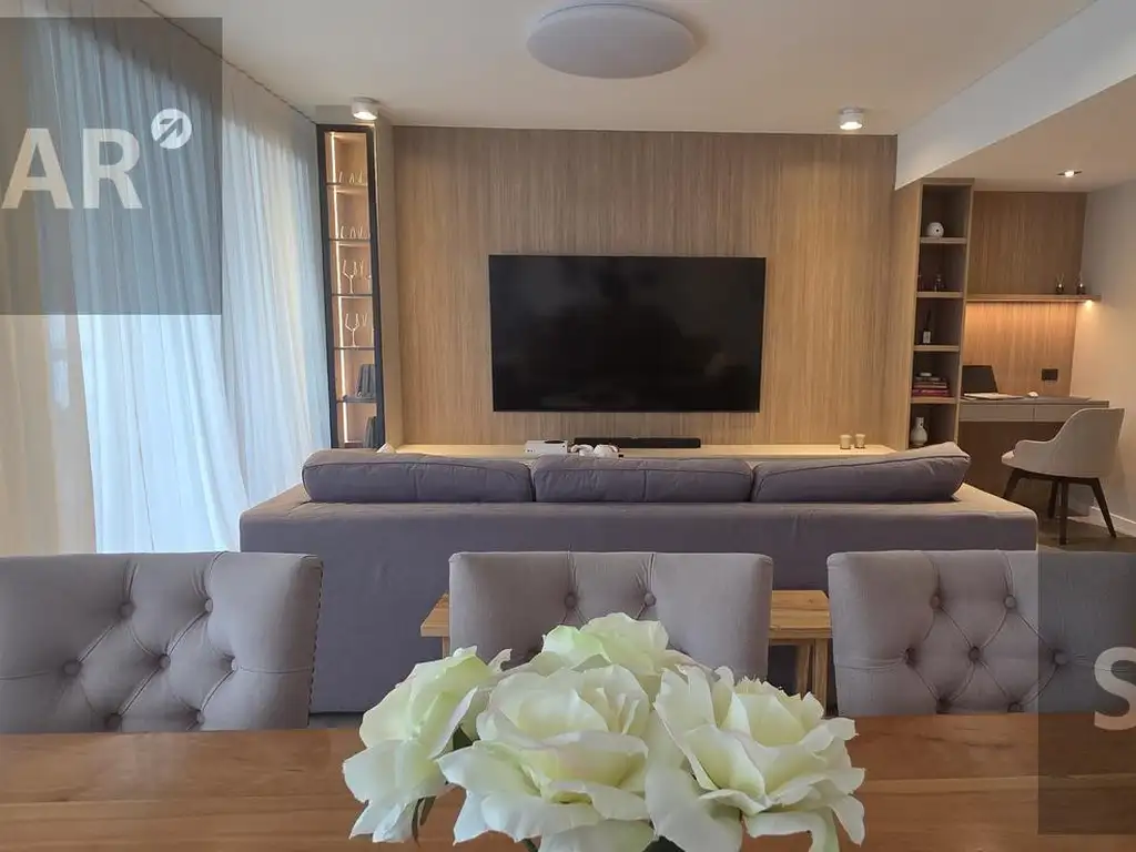 El departamento ofrece un amplio living comedor con salida a dos balcones, uno de ellos con parrilla y cerramiento de vidrio templado. La cocina es independiente y está completamente amoblada, con lavadero y caldera dual. Cuenta con 3 dormitorios, uno en suite con vestidor, todos con persianas de aluminio. Los baños están equipados con mamparas de vidrio templado.