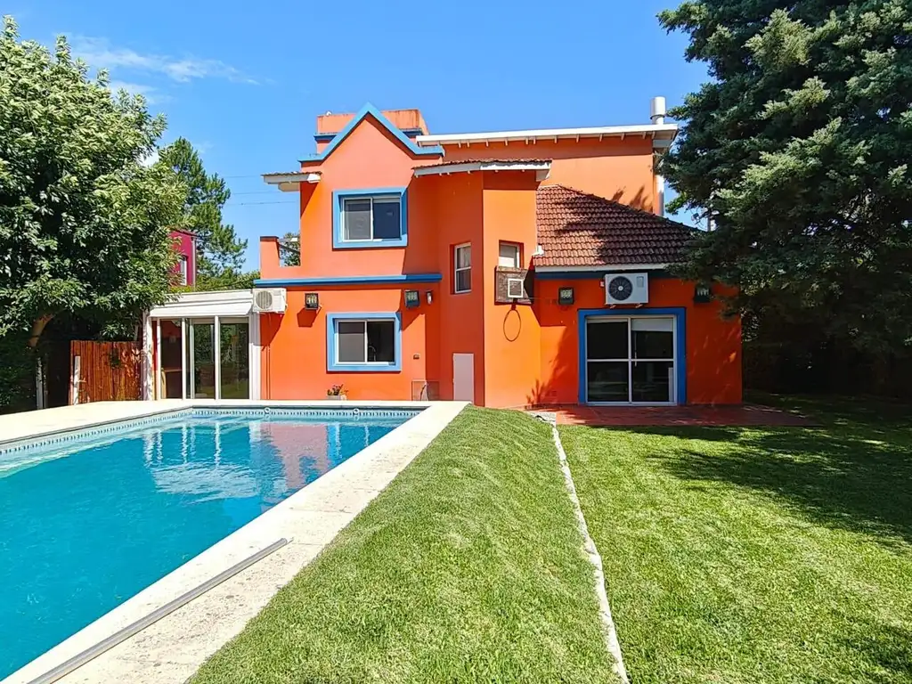 El exterior de la vivienda es igualmente impresionante. Un jardín completamente parquizado ofrece privacidad y belleza, complementado por una piscina de 8x4 m con venecitas y un sistema de riego automatizado. La galería/cochera cubierta para 2 autos con techo de policarbonato añade practicidad y estilo.