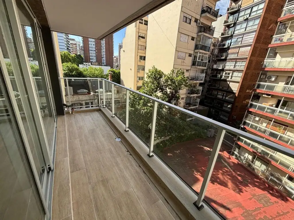 La propiedad presenta un gran ventanal que permite el ingreso de luz natural, generando un ambiente luminoso y amplio. Cuenta con pisos de madera clara que aportan calidez y elegancia, y un balcón al contrafrente con vista despejada que expande visualmente el espacio interior.