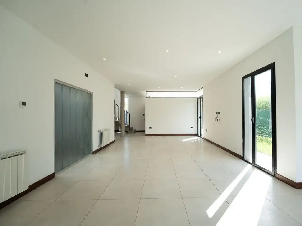 Planta Baja: Se accede a un hall recibidor donde se desarrolla la escalera hacia el nivel superior. El área social se integra mediante un estar-comedor vinculado a la cocina a través de una barra. La cocina cuenta con mesadas de granito Negro Brasil, mobiliario bajo mesada de diseño, una alacena esquinera e instalación y espacio para lavavajillas. Este nivel dispone de lavadero independiente, un toilette y un patio de aire y luz que favorece la ventilación natural. El sector social se expande hacia el exterior mediante una abertura corrediza de tres hojas que aporta iluminación y conecta con el sector de parrilla, el cual incluye mesada con bacha.