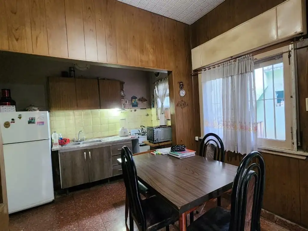 Luego, la cocina comedor con mueble bajo mesada y alacena, con buen espacio de guardado. Desde allí, podemos salir al segundo patio de la unidad, en este caso al contrafrente. Allí encontramos un lavadero y la escalera de material que nos conduce a la terraza donde hay un quincho más un ambiente que fue utilizado como dormitorio y ahora funciona como galpón de guardado.
