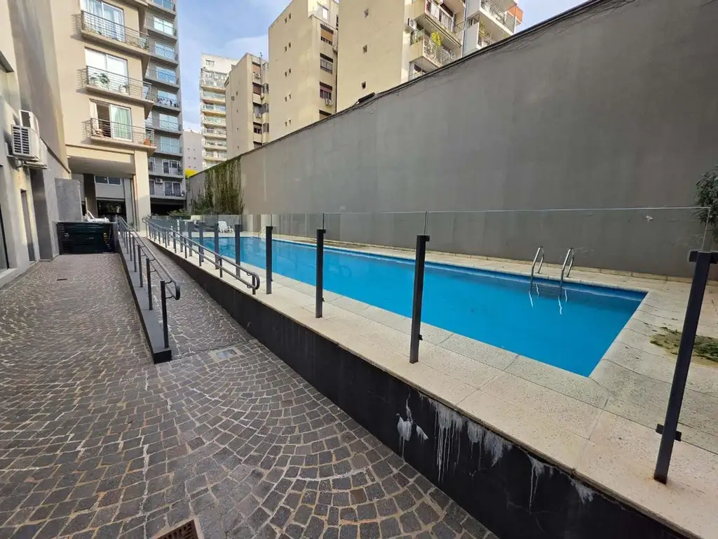 El edificio ofrece excelentes amenities que potencian la calidad de vida: seguridad 24 horas, pileta de natación, laundry, salón de usos múltiples, área de juegos infantiles, ascensor y espacios verdes. Cochera disponible para alquiler dentro del complejo.