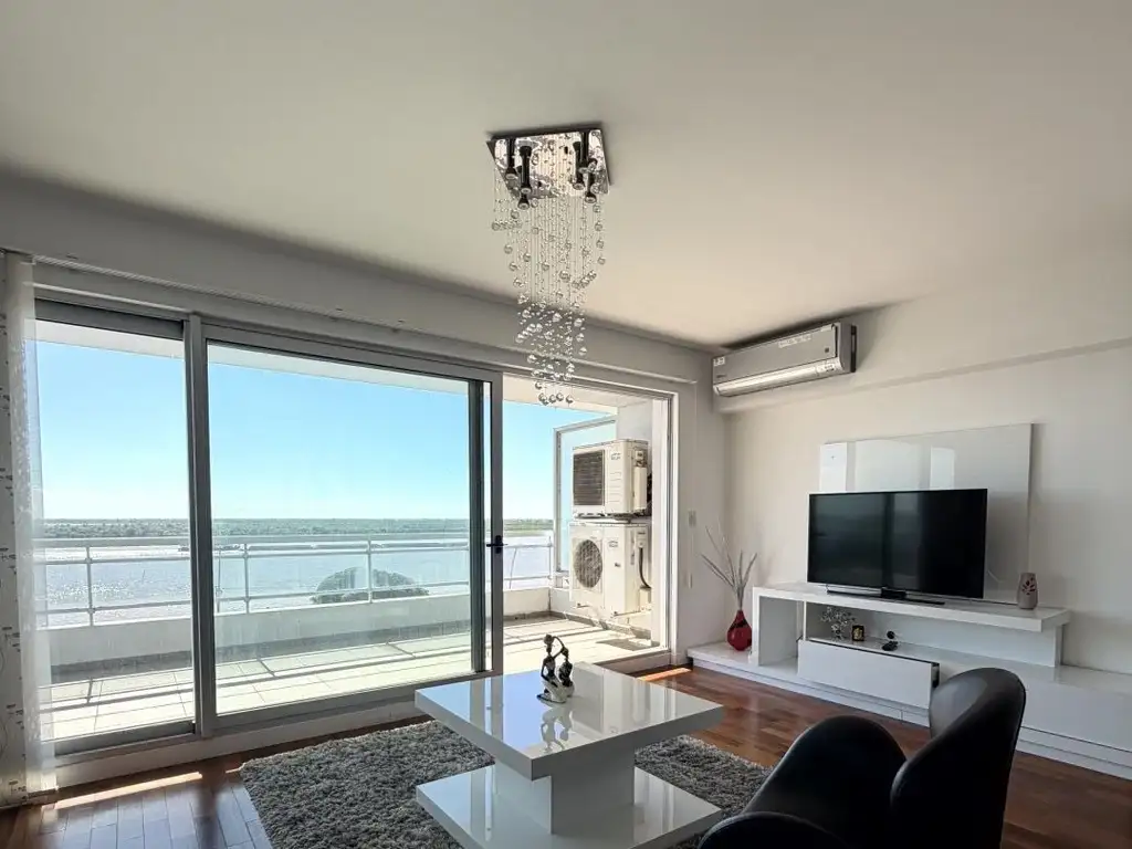Este departamento en alquiler cuenta con una inmejorable vista al río desde un balcón aterrazado al frente. Tiene doble ingreso, y esta compuesto de living-comedor, cocina integrada con isla, baño de recepción, lavadero separado y dos dormitorios con vestidor y baño en suite.