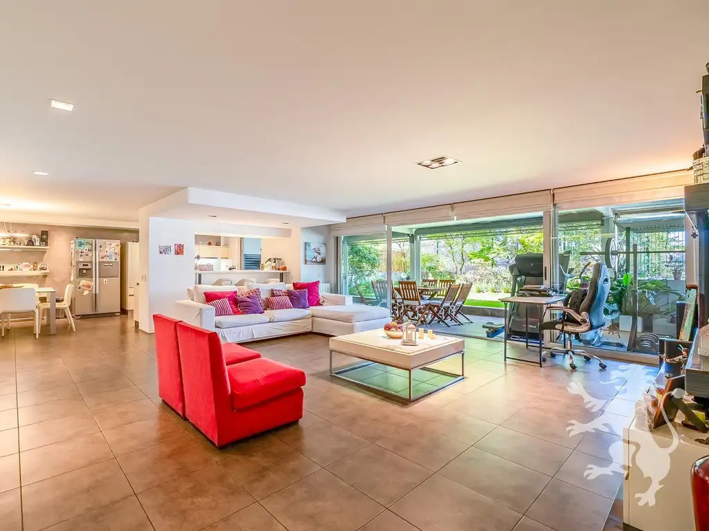 - Cocina integrada moderna, funcional y totalmente equipada (horno eléctrico, microondas y anafe a gas) con salida visual al jardín y galería