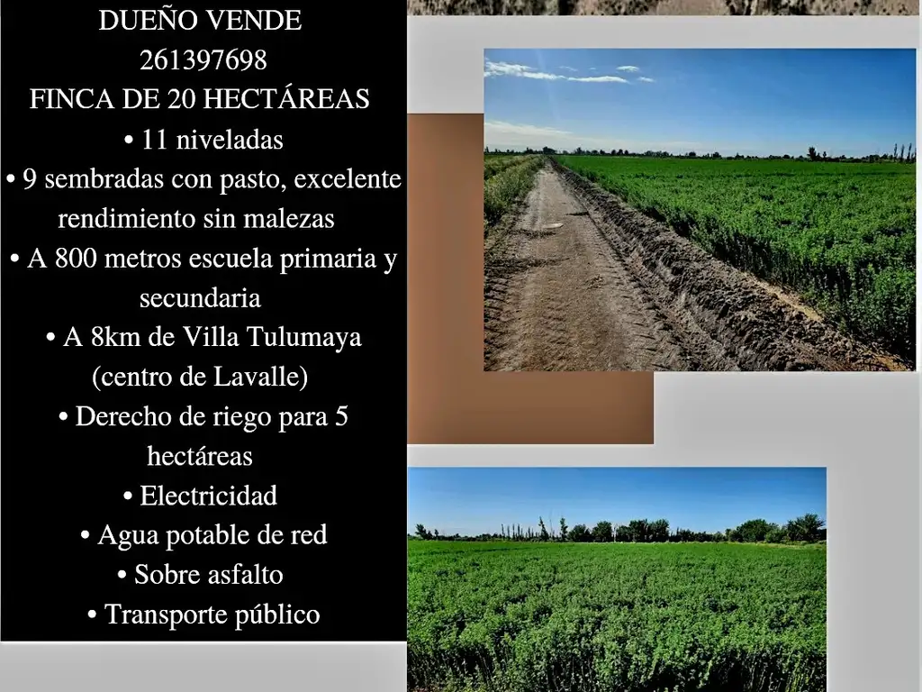 En la hermosa provincia de Mendoza, específicamente en Lavalle, se encuentra esta increíble finca de 20 hectáreas que ofrece una oportunidad única. Con 11 hectáreas niveladas y 9 sembradas con pasto de excelente rendimiento, este terreno es ideal para actividades agrícolas y ganaderas.