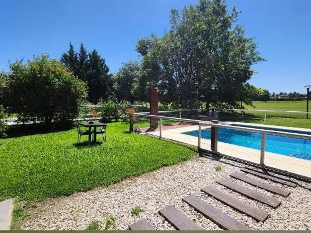 3 Habitaciones en planta alta, 1 en suite con baño, vestidor y balcon. en planta baja nos encontramos con un living amplio, con luminosidad natural y cocina y comedor amplios con concepto abierto. la propiedad cuenta con calefaccion central, lavadero y galeria semicubierta. En el exterior nos encontramos con parque de 1000 mts. con vista al Golf, piscina cercada, y duchador.