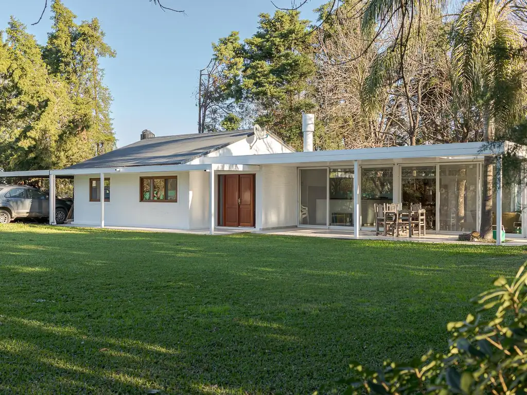 El terreno es amplio y arbolado, con jardín, pileta y un quincho cerrado de amplias dimensiones, equipado con hogar a leña, cocina completa y aberturas nuevas, perfecto