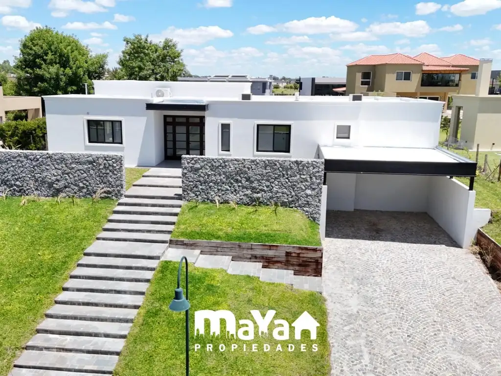 Esta propiedad moderna se desarrolla íntegramente en una planta sobre un lote alteado, lo que le otorga una presencia imponente desde el acceso. El frente se destaca por sus paredones revestidos en voladura de pórfido, que enmarcan la escalera principal y generan un ingreso distinguido.