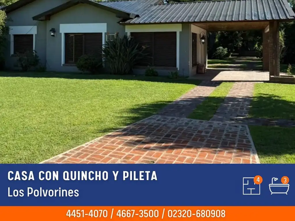 CASA 4 AMBIENTES DE 370 M2 SOBRE UN LOTE DE 2800 M2 CON LIVING COMEDOR AMPLIO, COMEDOR DIARIO, COCINA CON BAJO MESADA Y ALACENA, HORNO EMPOTRADO, ANAFE Y MESA DESPLEGABLE, LAVADERO SEPARADO CON PLACARD, GALERÍA, COCHERA CUBIERTA AL COSTADO, TRES DORMITORIOS (EL PRINCIPAL EN SUITE CON BAÑO, ANTE BAÑO Y VESTIDOR; Y DOSDORMITORIOS LUMINOSOS), UN BAÑO COMPLETO, PILETA DE MATERIAL DE 6 X 12 MTS CON FILTRO, SOLARIUM DE LAJA, QUINCHO CERRADO CON PARRILLA, VESTIDOR Y BAÑO. ATRÁS DEL QUINCHO HAY UN GARAGE TIPO QUINCHO.