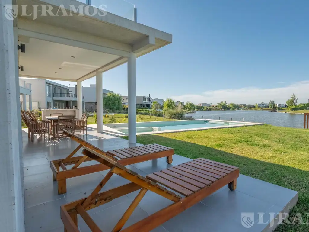 Cocina super equipada, integrada al comedor diario. Luego podemos ver un amplio living comedor con vista a la laguna.