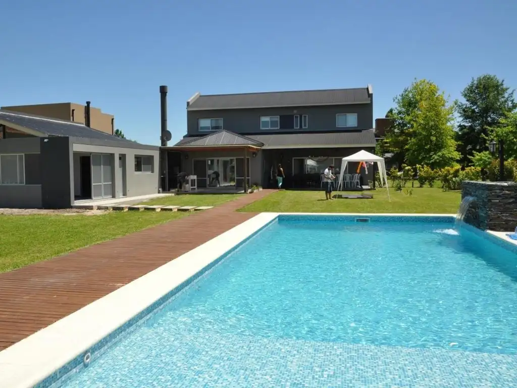 Hermosa casa amueblada en Barrio Sausalito emplazada sobre lote central de 1500 mts2 a sólo 100m del ingreso principal y piletas de natación, SUM y plazas, cuenta con luminoso living comedor, cocina totalmente equipada, lavadero, dependencia, departamento adicional anexado como quincho o dormitorio extra, tres baños completos, toillete, tres dormitorios principales, un dormitorio secundario o playroom, galería techada con parrilla, parque de 1500m2 con cerco apto mascotas. Piscina12 X 6M climatizada con deck y solarium.