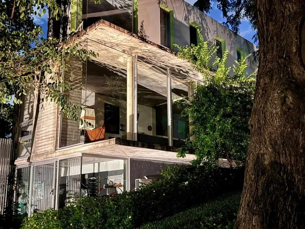 La implantación de la casa acompaña la barranca con un gran jardín, un living exterior entre arboles con sombra, el sector de la piscina con su espacio completamente al sol, un área de canchita de futbol y quincho totalmente equipado.