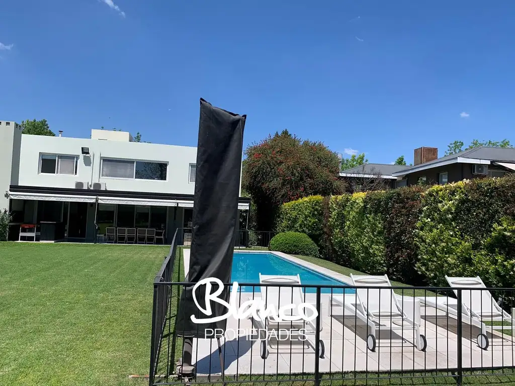 Exterior: Gran galería con parrilla y barra. Espectacular jardín + pileta con protección. Cochera cubierta para dos autos.