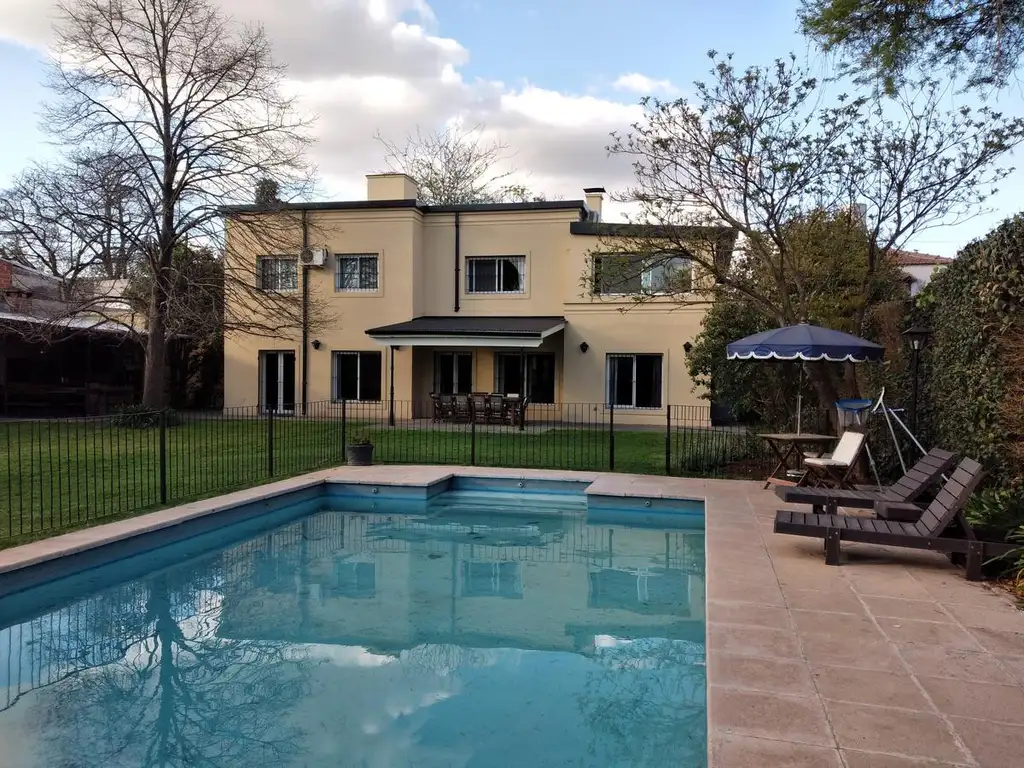 Amplio jardín con pileta de 10x 5 mts con filtro, reposeras y sobrilla con mesa y sillas, quincho cubierto para 27 personas, disco con garrafa y fogonero con asador. 3 Reflectores. 4 AA y 15 ventiladores. 2 modems de wifi. Pack futbol. Gimnasio. Ping-pong, metegol, aro basquet, croquet. Colchoneta saltarín. 3 livings interiores y 1 exterior. 3 heladeras, 2 lavarropas. Lavavajillas . Microondas. 2 escritorios. Espacio co-working. 2 suites. Camilla de masajes. Para 9/11 personas. Riego por aspersores. Portón automático. Cerco perimetral eléctrico. Servicio de jardín y pileta incluído.