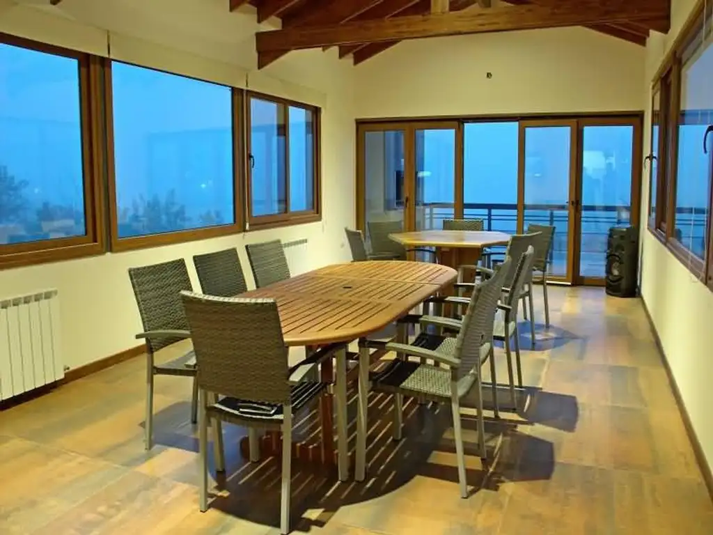 Planta Alta: Amplio comedor con TV de 75 con DirecTV, equipo de música vertical y ventilador de techo. Cocina completa con heladera con freezer y microondas. Terraza con asador.