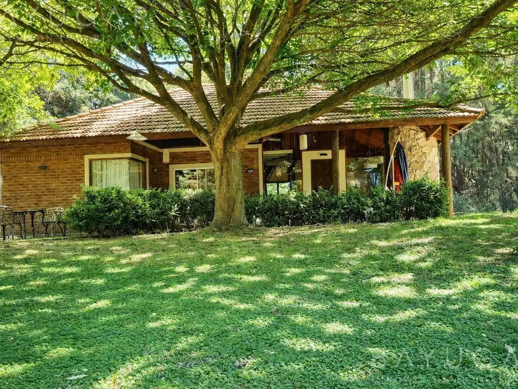 Implantada sobre un parque de aproximadamente 1.800 m2 con destacada forestación. Desde la amplia galería se accede a la piscina con forma de riñón, sector de jardín y pérgola equipada con parrilla, asador, pileta con agua caliente, mesa y bancos.