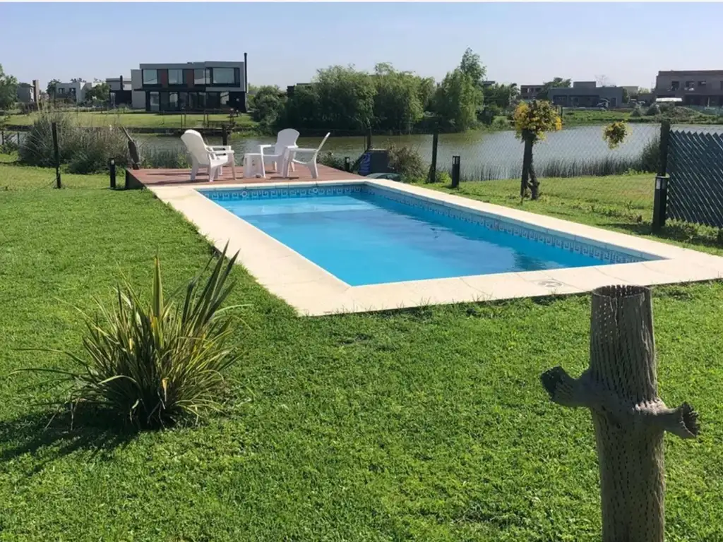 Pileta con agua climatizada con caldera peisa (disponible de septiembre a abril), y Deck con mesa y sillas.