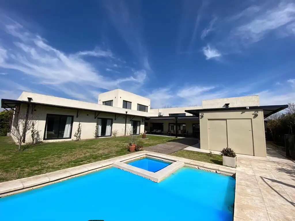Al exterior un hermoso jardin completamente parquizado, galería semi-cubierta con parrilla, pileta con solarium, baño exterior y oficina con ingreso independiente. En el frente cochera cubierta para dos vehículos y descubierta para otros dos. Lote con vista abierta al espacio comun del barrio.