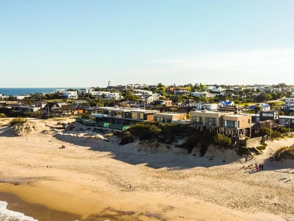 Con acceso directo desde el médano, la casa está tan próxima a la playa que el sonido del mar es parte del ambiente diario. Construida en altura para privilegiar las panorámicas, la casa principal ofrece una imponente máster suite con vestidor y vista al mar, acompañada de una segunda suite con encantadoras vistas al pueblo. Cocina americana integrada, toilette de recepción y lavadero completan sus espacios interiores.