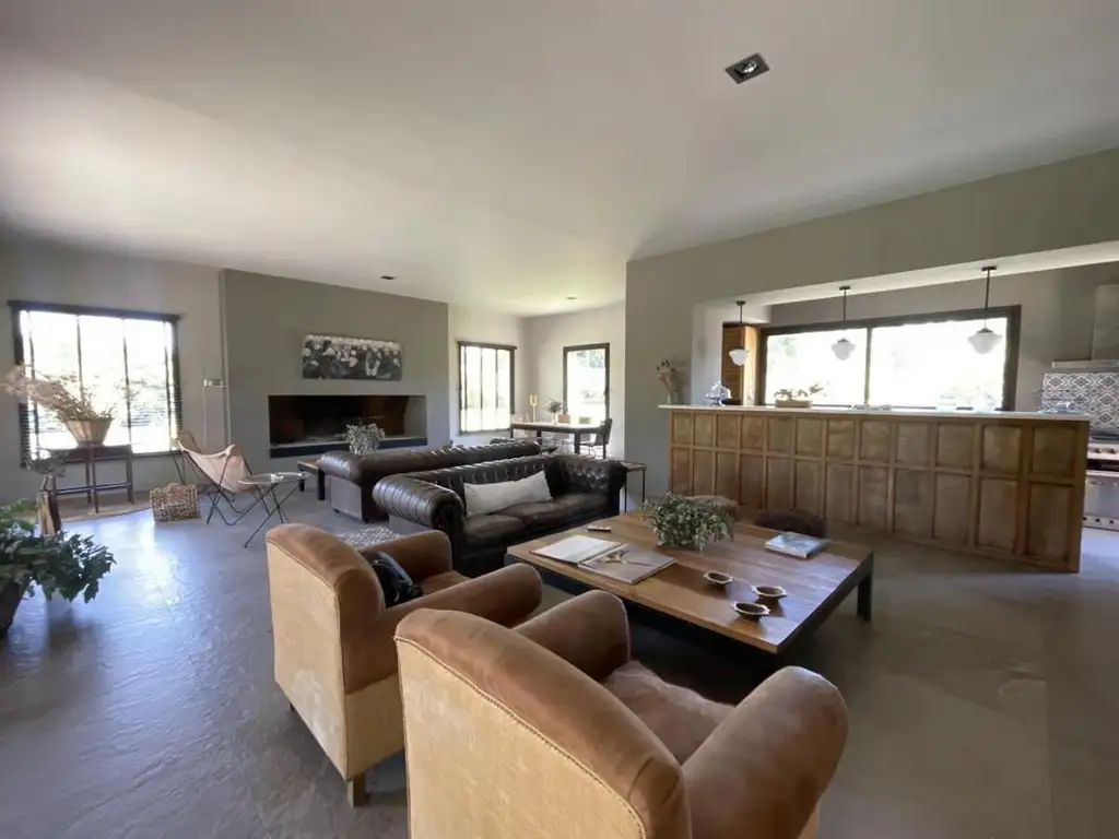 Gran living comedor con hogar a leña con cocina integrada y barra desayunadora
