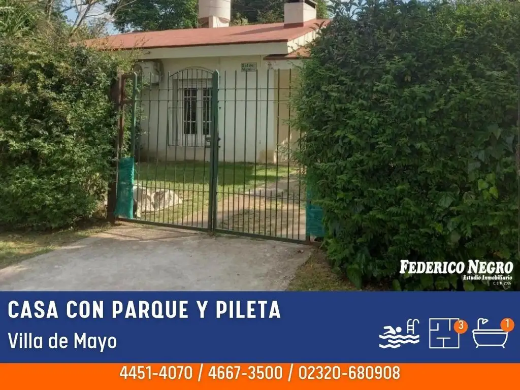 CASA TRES AMBIENTES DE APROX 60 M2 SOBRE LOTE DE 1.100 M2 CON LIVING COMEDOR, COCINA, DOS DORMITORIOS CON PLACARD, BAÑO, PARQUE CON PILETA Y ENTRADA PARA AUTO.