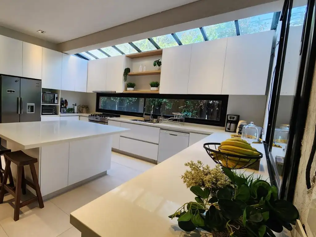 - living y comedor con chimenea, cocina recién refaccionada a nueva, toda blanca, amplia y luminosa