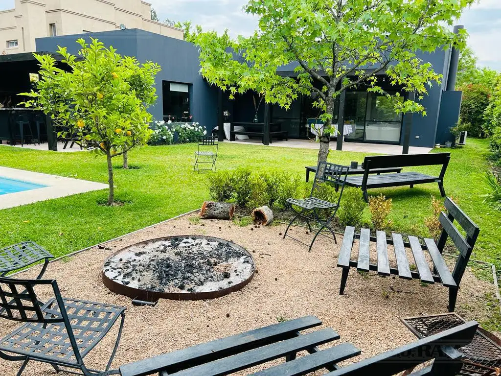 EXTERIORES: Galería cubierta con parrilla y barra, living comedor exterior. Rincón con fogonero y parrilla. Pileta con solárium. Riego automático. Garage para 3 autos.