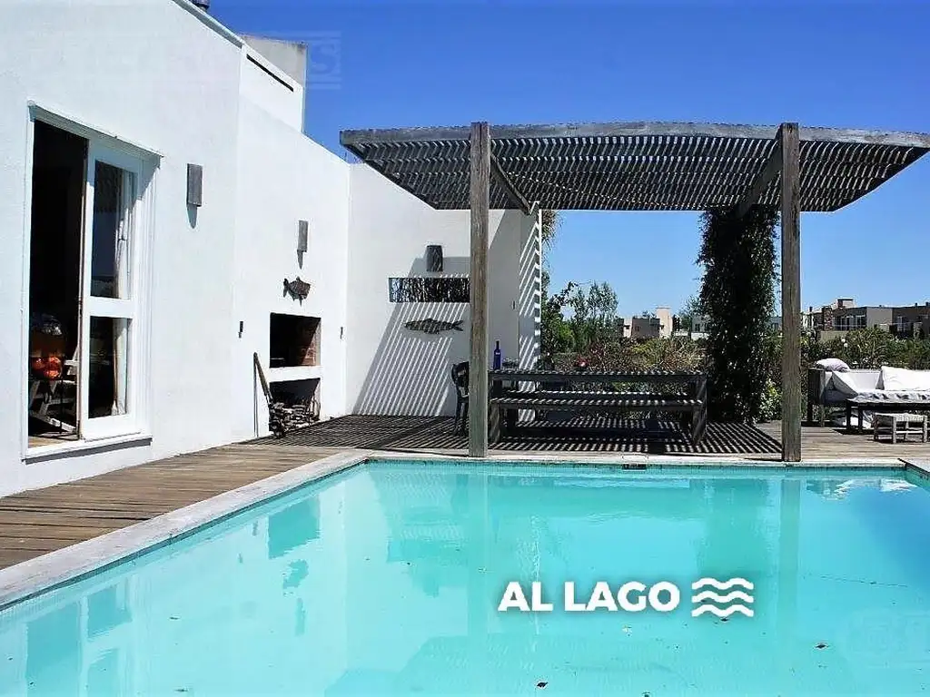 Barrio Cerrado Santa Catalina, Puerta 1 (la más cercana a Panamericana, Ramal Escobar), del Complejo Villanueva. Hermosa casa estilo playa, muy luminosa, de 260m2 aprox cubiertos + 35m2 aprox semi-cubiertos, sobre Lote a la Laguna de 1.200m2 aprox. Pisos de madera.