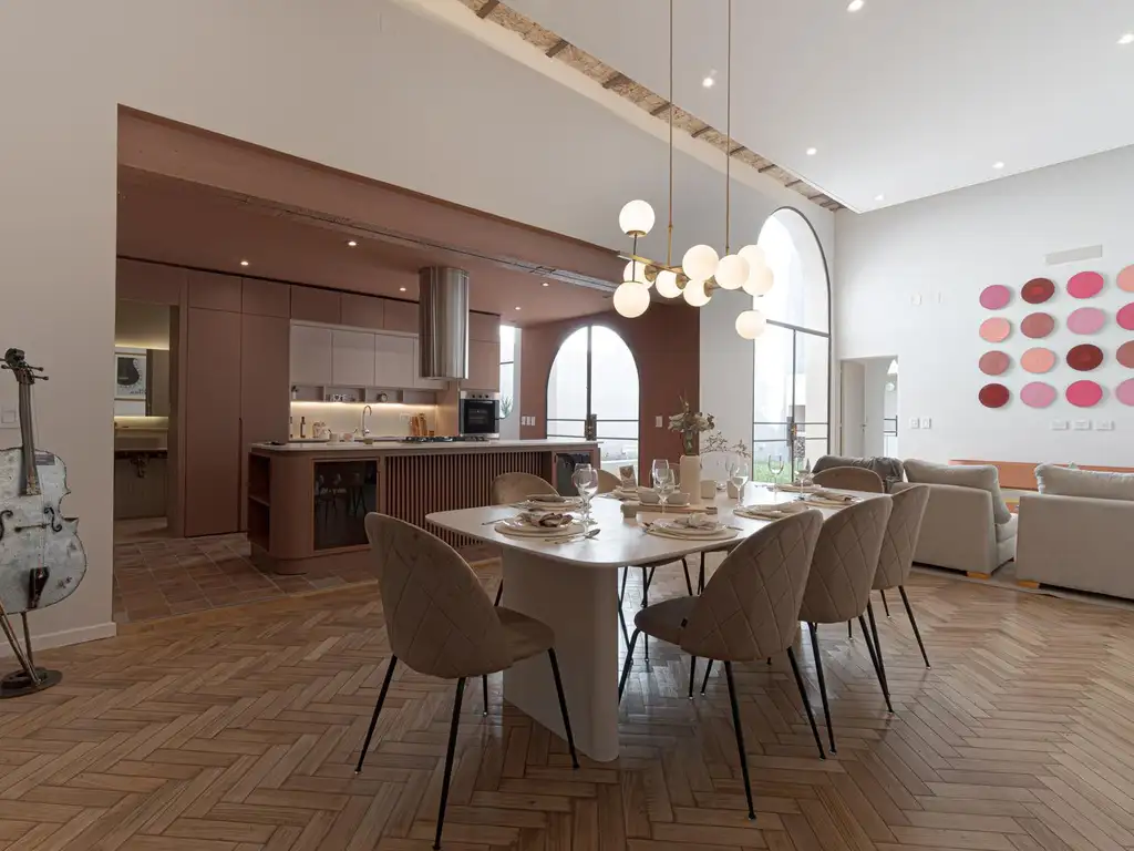 Observaciones: Algunos de los pisos son de parque de madera, pinotea, granito y baldosas de cemento pintadas, las aberturas de hierro, otras de aluminio con DVH y algunas en madera con persianas en el mismo material, correcto enrejamiento al frente, placares completos con interiores, luminaria exterior, caldera para agua caliente, preinstalación de A/A y radiadores (no incluye artefactos). Techos altos planos y tanque de agua a altura. Cocina con mobiliario completo de bajo mesada, alacena, bacha de acero inoxidable amplia, mesada en silestone blanco, anafe y horno diferenciados, campana purificadora y espacio oculto para heladera doble. Baños con loza sanitaria y griferías de primeras marcas, duchador con mamparas de vidrios, espejos y accesorios colocados, extractor o ventilación natural. Cochera con portón manual.