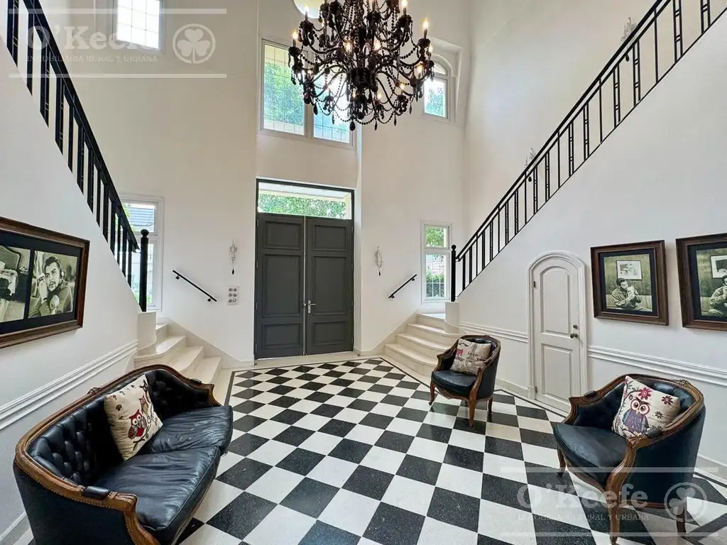 Imponente hall de entrada con doble altura, araña de hierro forjado y piso en damero.